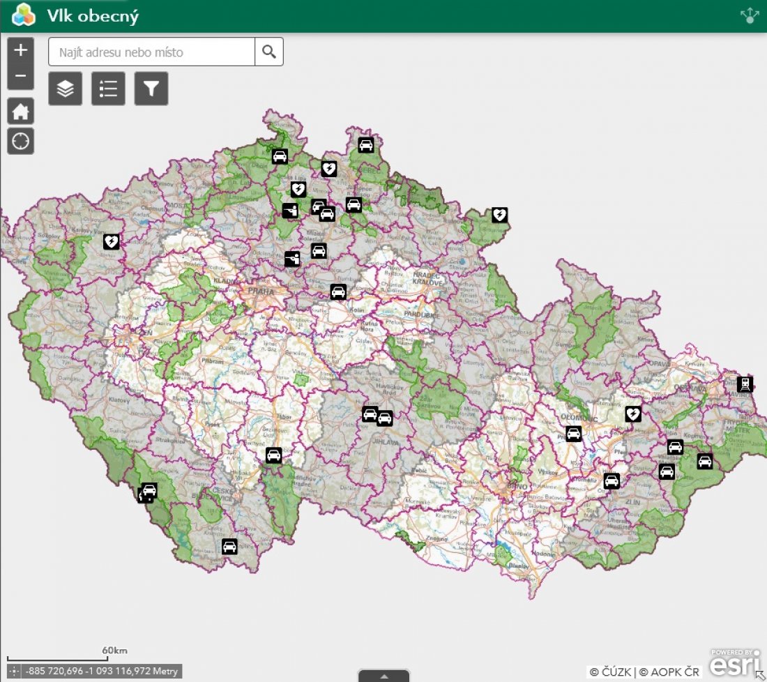 Mapa níže ukazuje, kde byly na území České republiky od roku 2012 zaznamenány úhyny vlka (kolize s dopravními prostředky, nelegální lov, neznámá příčina).