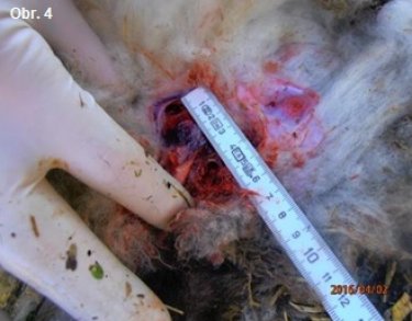 Obr. 3: Kořist vlka s vytrženým kusem hrdla (Foto: T. Krajča); Obr. 4: Vzdálenost mezi tesáky u vlků je zhruba 4,5 cm (Foto: L. Žák)