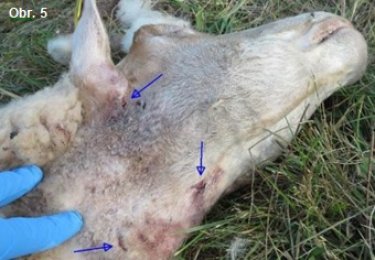 Obr. 5: Místa prokousnutí kůže na krku (Foto: P. Kuna); Obr. 6: Stopy na krku kořisti nemusí být otevřené rány, ale může se jednat o podlitiny (Foto: L. Žák)