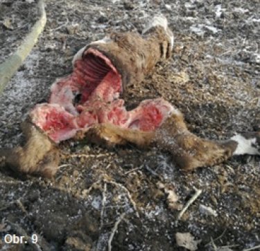 Obr. 7: Perforovaná břišní dutina s vyhřeznutými vnitřnostmi (Foto: L. Žák); Obr. 9: Otevření břišní dutiny a vyjedení vnitřností telete (Foto: J. Feřtová)