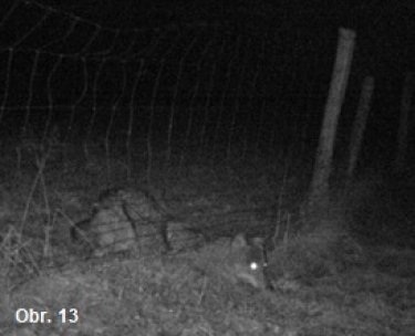 Obr. 12: Šterbina mezi plotem a zemí u pastviny, kde opakovaně došlo k útokům (Foto: J. Jelínková); Obr. 13: Vlk zachycený fotopastí při podlézání plotu na pastvinu s ovcemi (Foto: L. Žák); Obr. 16: Detail oplocení a místo podhrabání (Foto: P. Lumpe)
