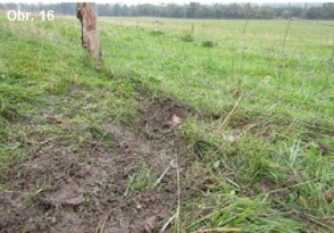 - Je dobré projít celou pastvinu a oplocení a najít místo, kudy se vlk do ohrady dostal. Vlk ohradu ve většině případů nepřeskakuje, ale podlézá nebo se podhrabává (Obr. 13). Uvést tyto nedostatky oplocení do protokolu. (V těchto místech je možné najít chomáče srsti ve spodní části oplocení, více viz část D Výzkum).