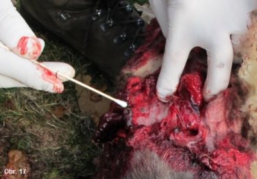 Obr. 17: Odběr vzorku slin z okolí rány napadeného zvířete (Foto: L. Žák)