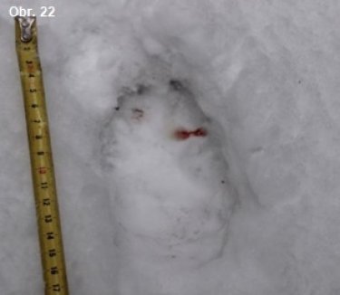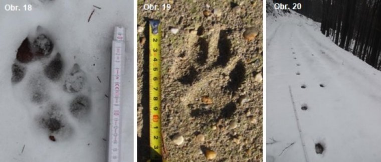 - Pokud potřebujeme přesně dokumentovat stopy - 3x vyfotíme krok s měříkem, krokem se rozumí tři dvojšlapy, které měříme od paty otisku k patě; a 3x vyfotíme otisk (stopu) s měřítkem, přičemž stopu měříme bez drápů. Pokud je možné rozlišit otisk přední a zadní tlapy změříme i ty.