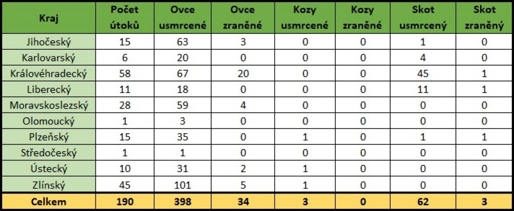 (Uvádíme souhrnně, jelikož škody vlkem na hospodářských zvířatech jsou v těchto dvou měsících každoročně s nižší četností.)