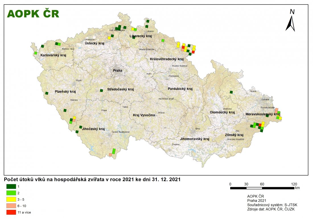 Přehled škod způsobených vlkem obecným v roce 2021